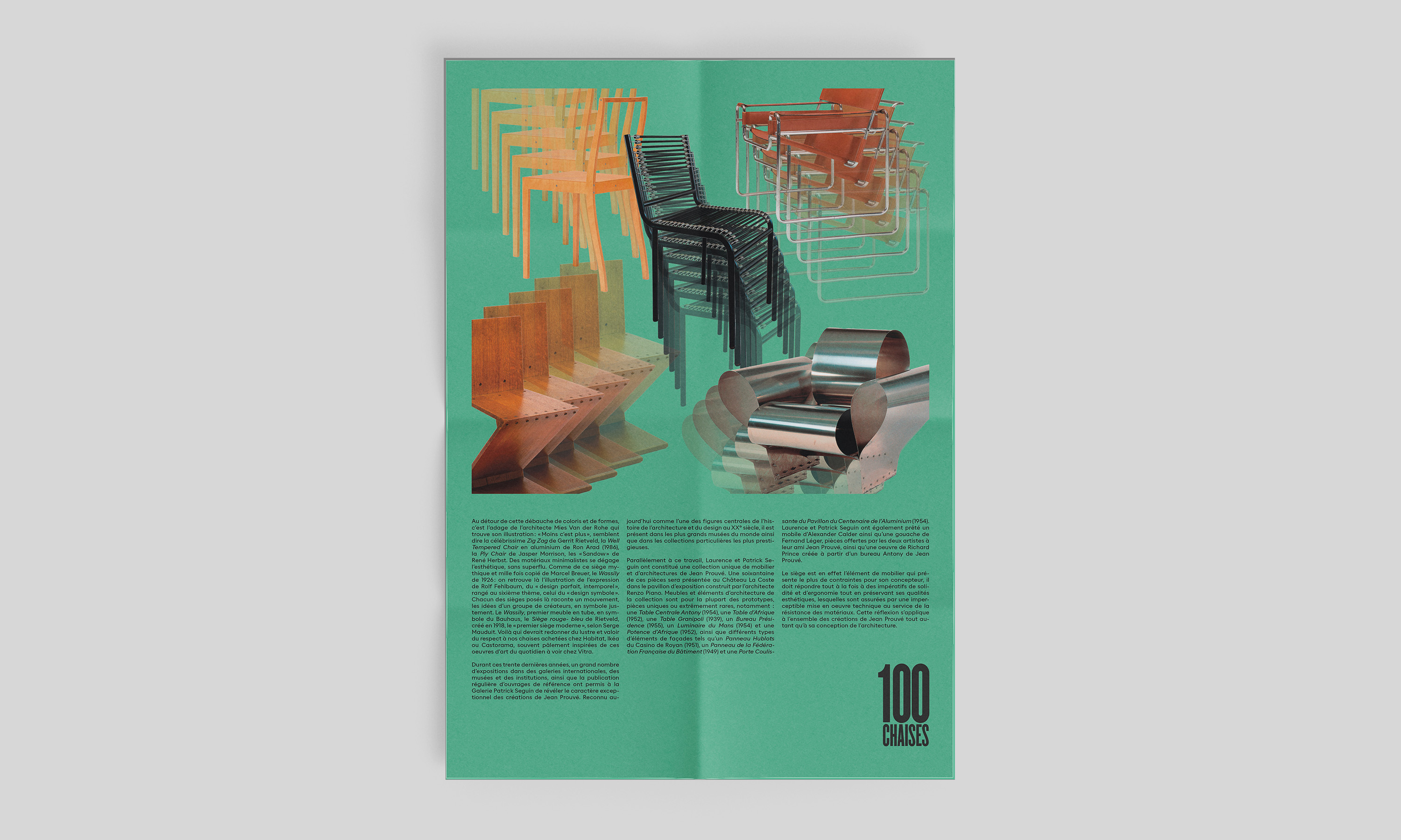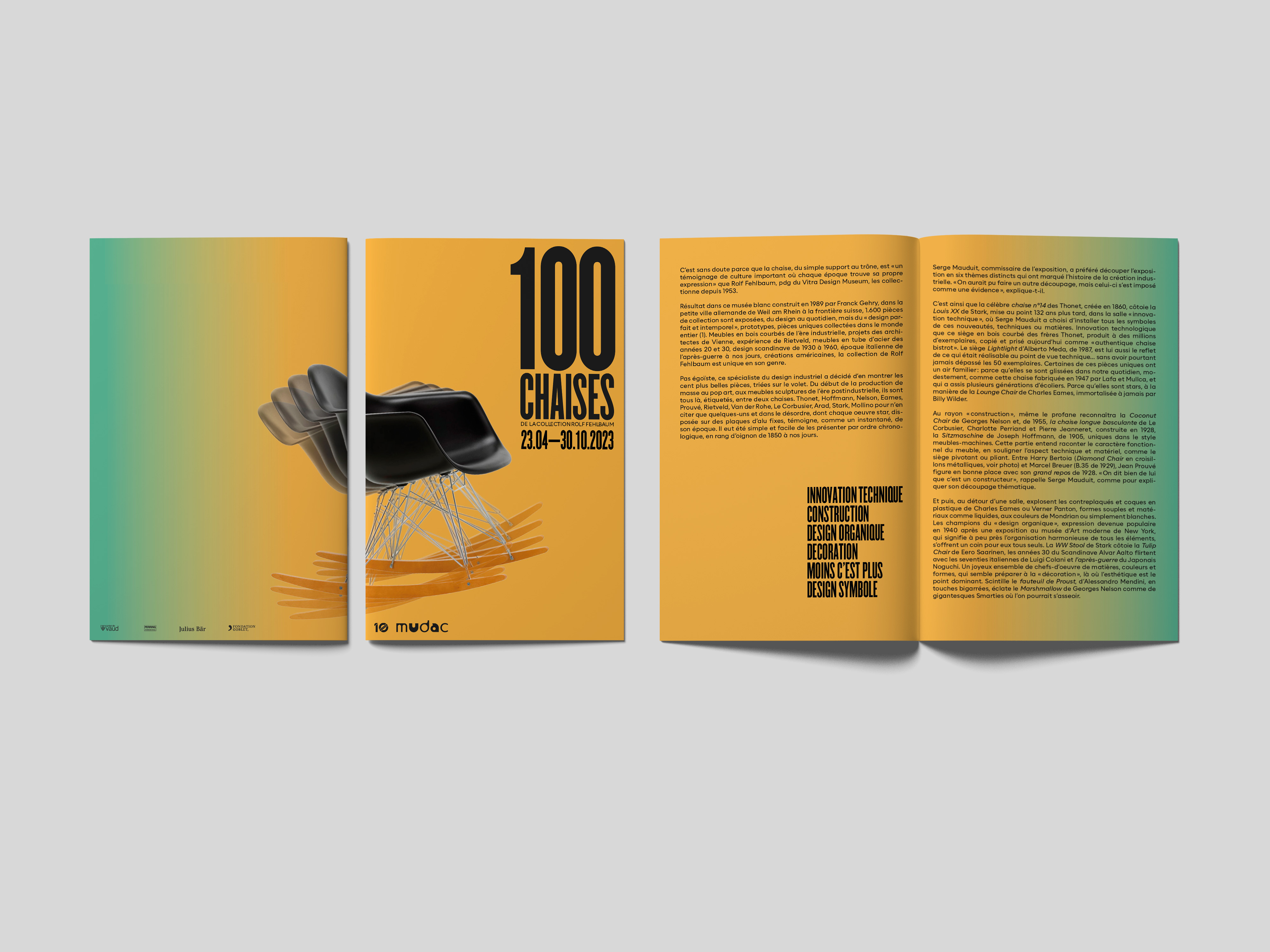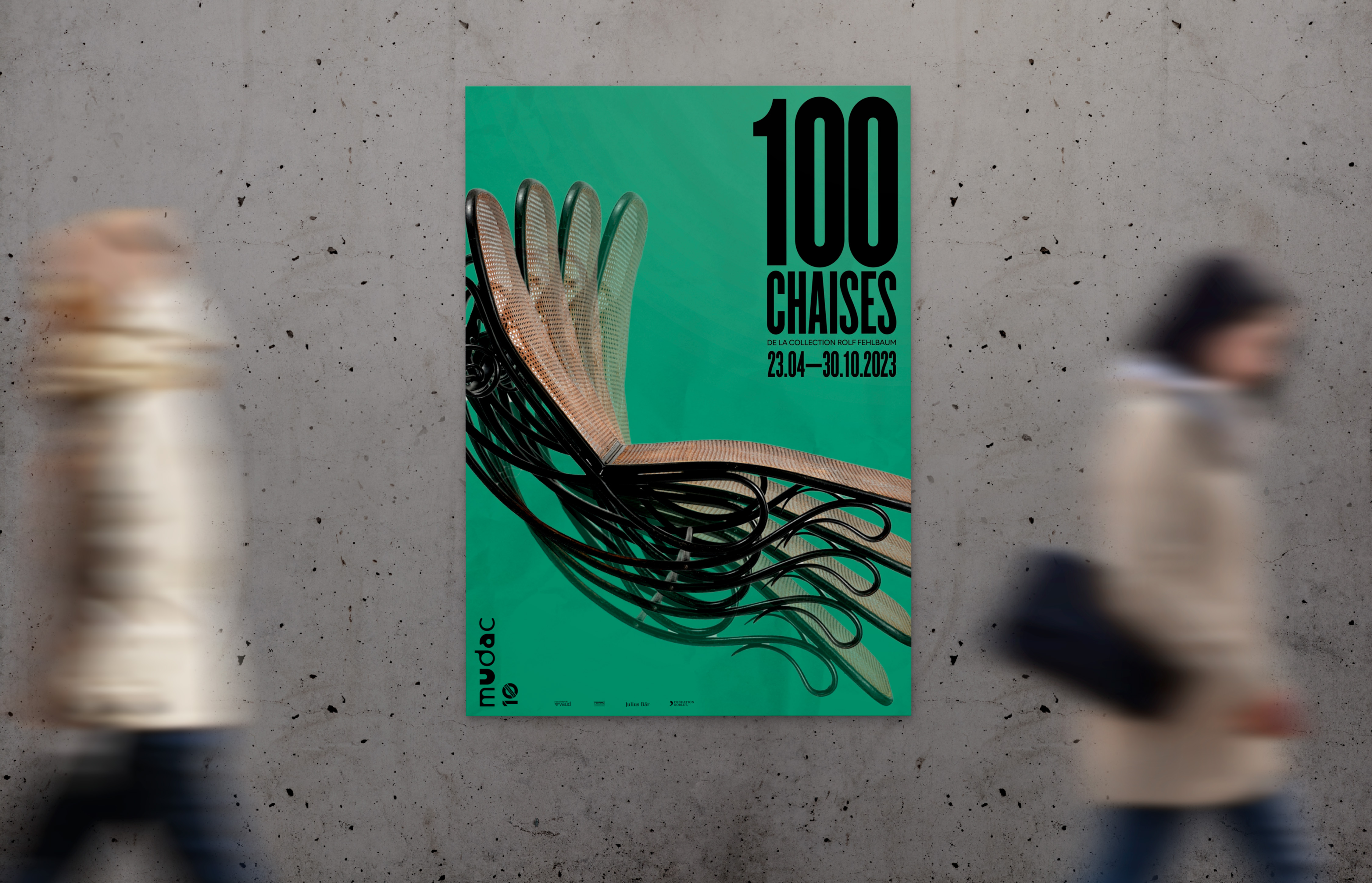 Visual identity for an exhibition of chairs at the Mudac, museum of design and contemporary applied arts in Lausanne, focusing on the multitude of elements represented, creating a rhythmic reading.
